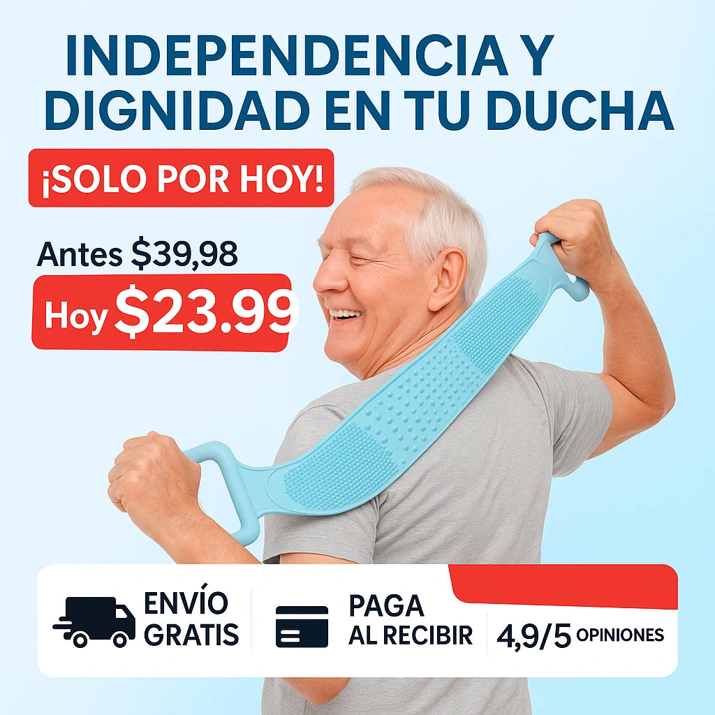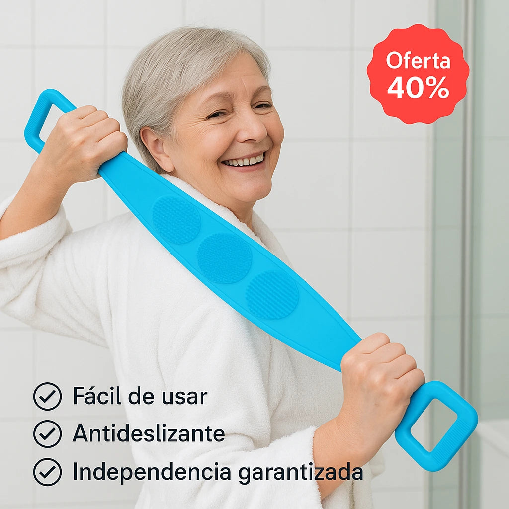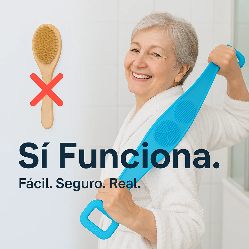 No es un cepillo común. Es un diseño ergonómico de silicona con asas dobles que permite alcanzar cada rincón del cuerpo sin movimientos bruscos, sin dolor y sin depender de nadie.