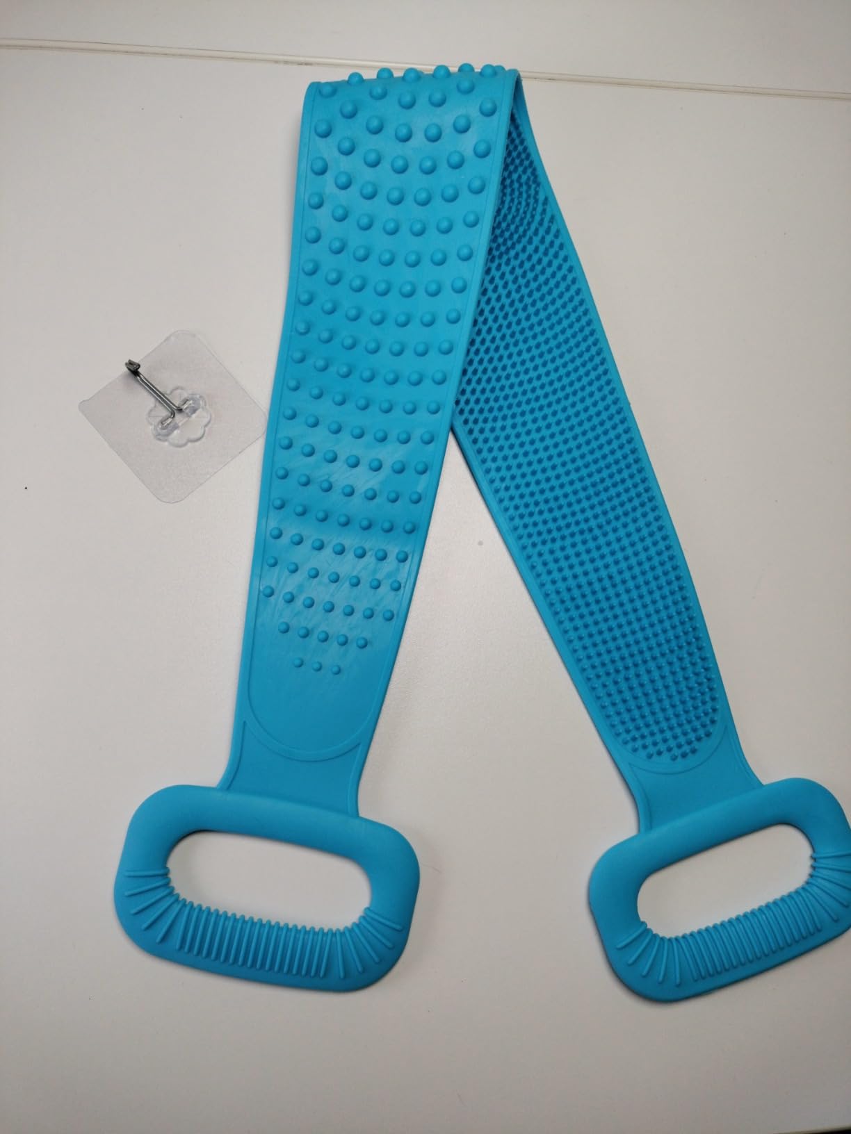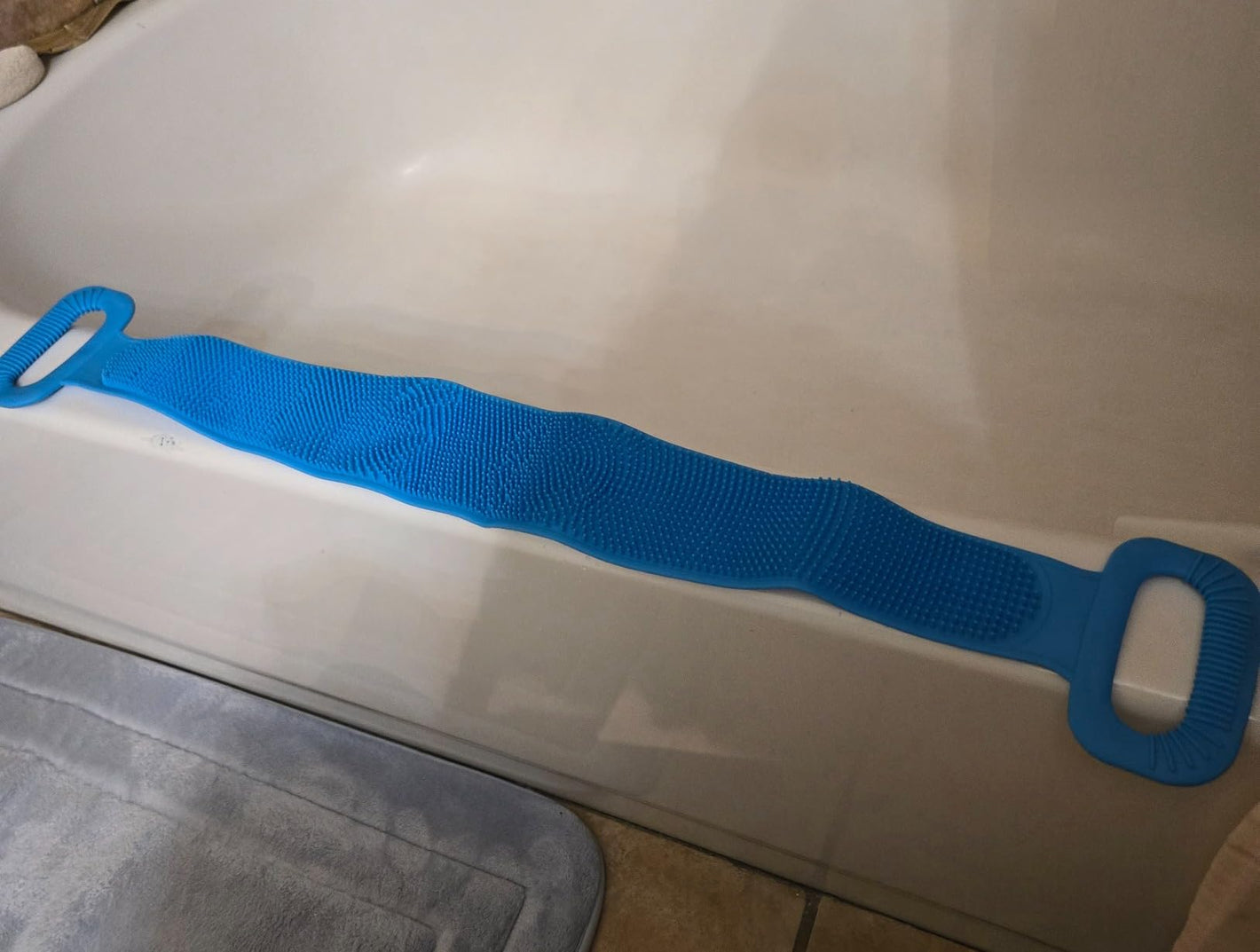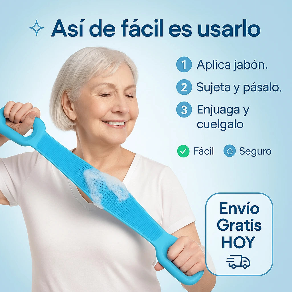 No es un cepillo común. Es un diseño ergonómico de silicona con asas dobles que permite alcanzar cada rincón del cuerpo sin movimientos bruscos, sin dolor y sin depender de nadie.